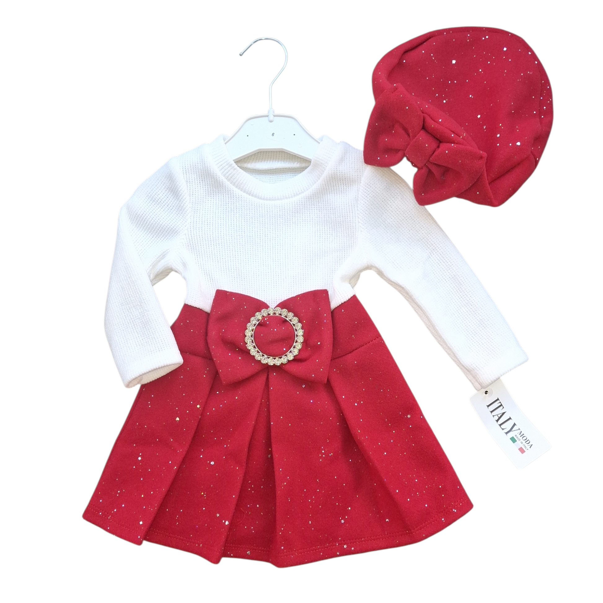 Completo di cappellino coordinato rosso con fiocco a lato.