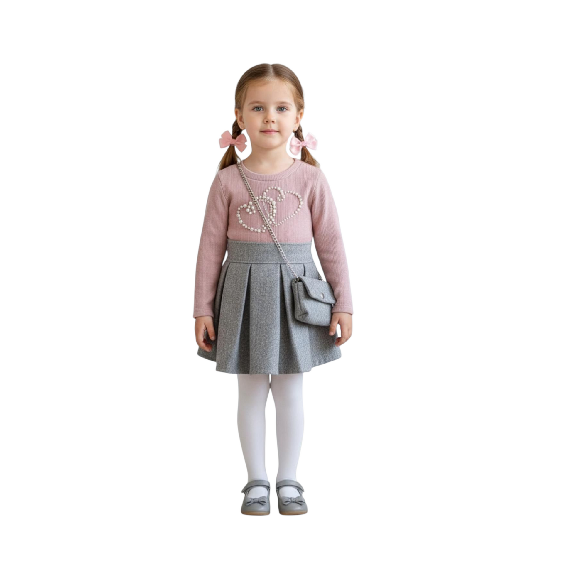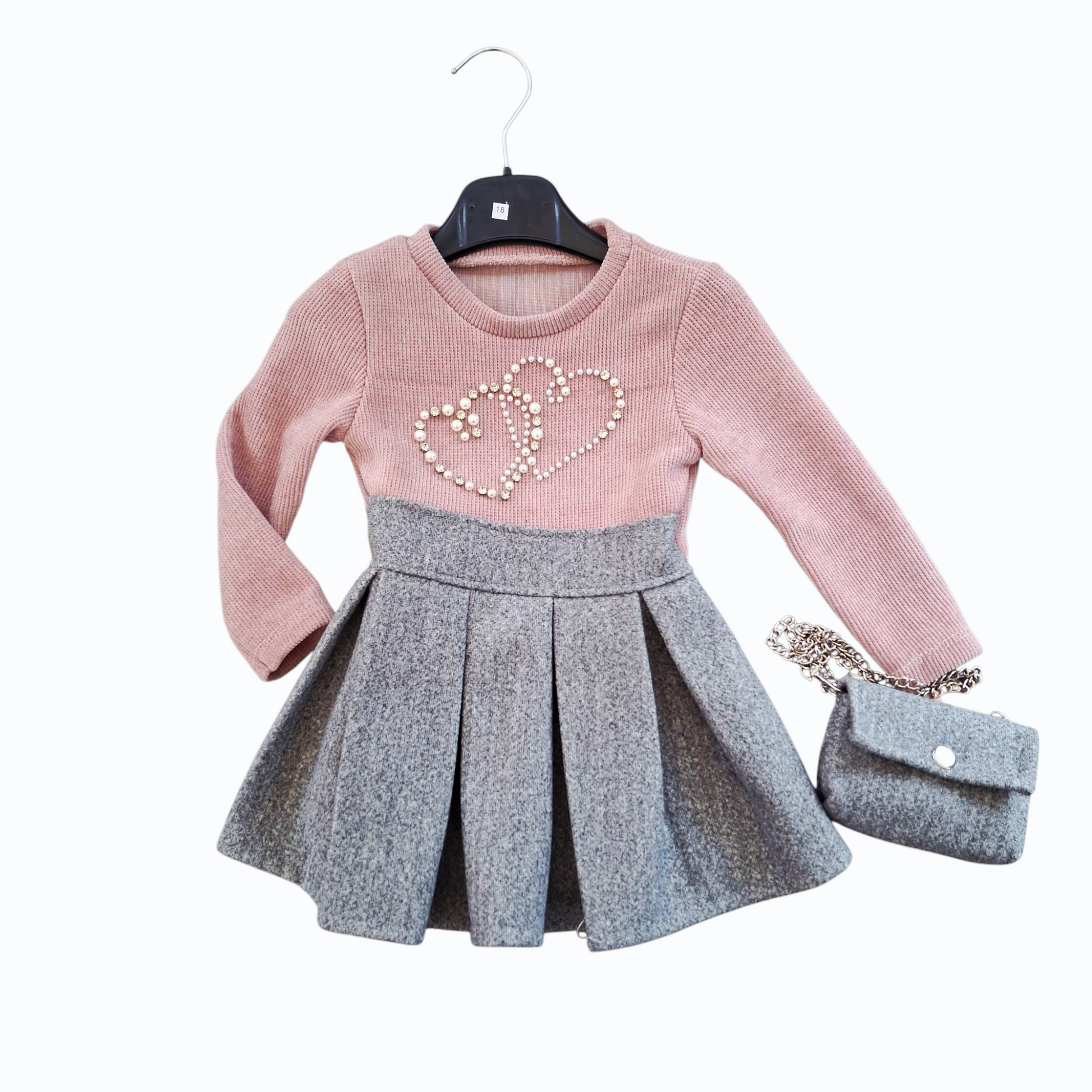 Abitino elegante per bambina con top in maglia rosa e cuore di perline, gonna grigia a pieghe,in pannetto plissettato. Borsetta abbinata, l' ideale per cerimonie e occasioni speciali.