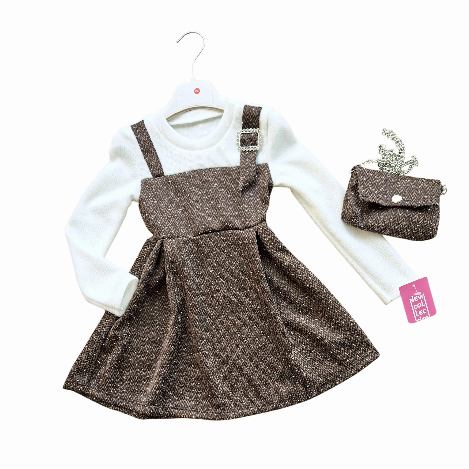 Delizioso abito perfetto per le piccole fashioniste! Realizzato in un tessuto caldo e morbido, combina un designe con finta salopette marrone ed un elegante maglia bianca a manica lunga.