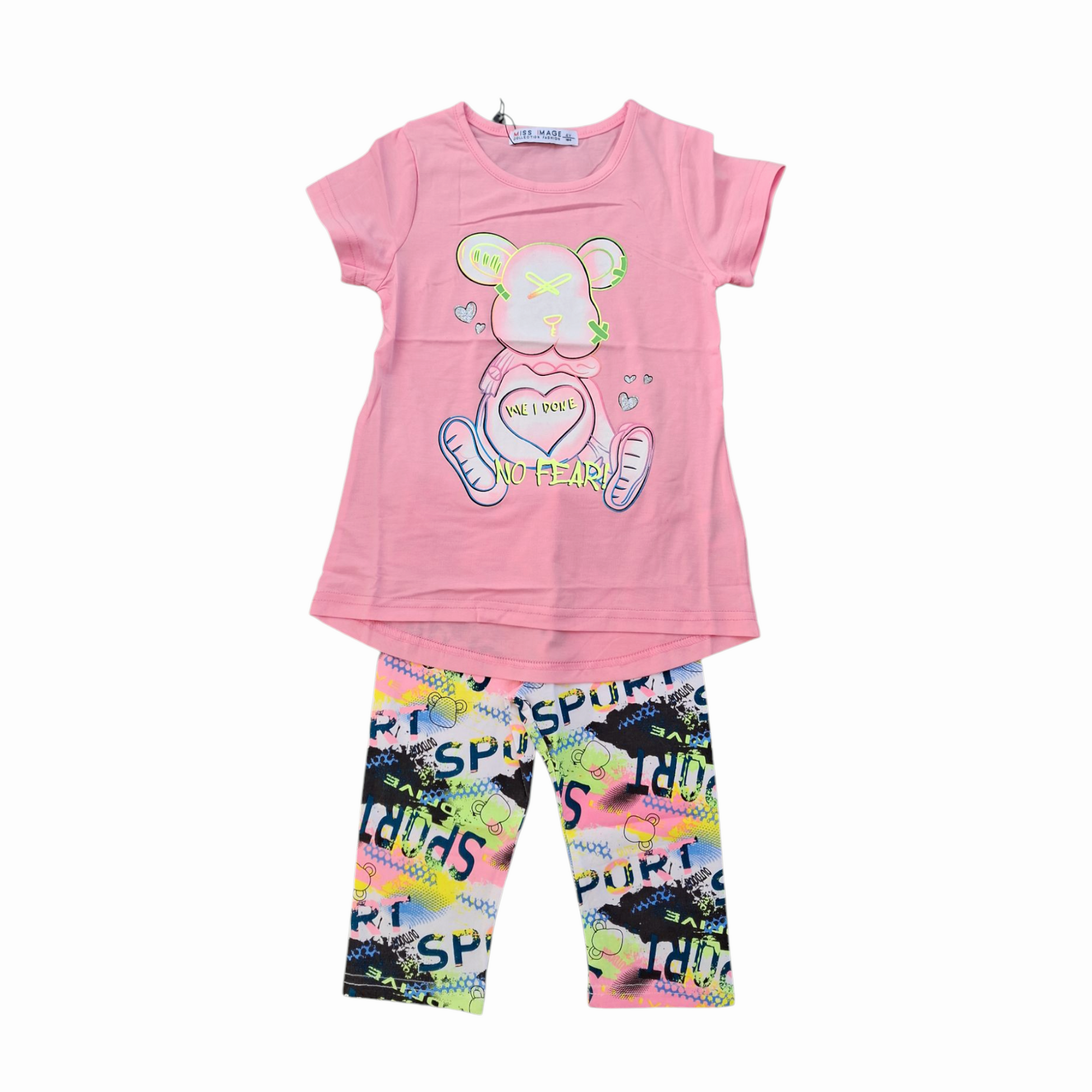 Completo da bambina, in cotone, composto da una maglietta lunga a manica corta e un pinocchietto con morbido elastico in vita. E' perfetto per le giornate estive! La maglietta a manica corta in morbido cotone garantisce comfort e freschezza, mentre il pinocchietto in cotone dona un tocco colorato al look. Realizzato con materiali di alta qualità, questo completo è ideale per la tua piccola principessa.