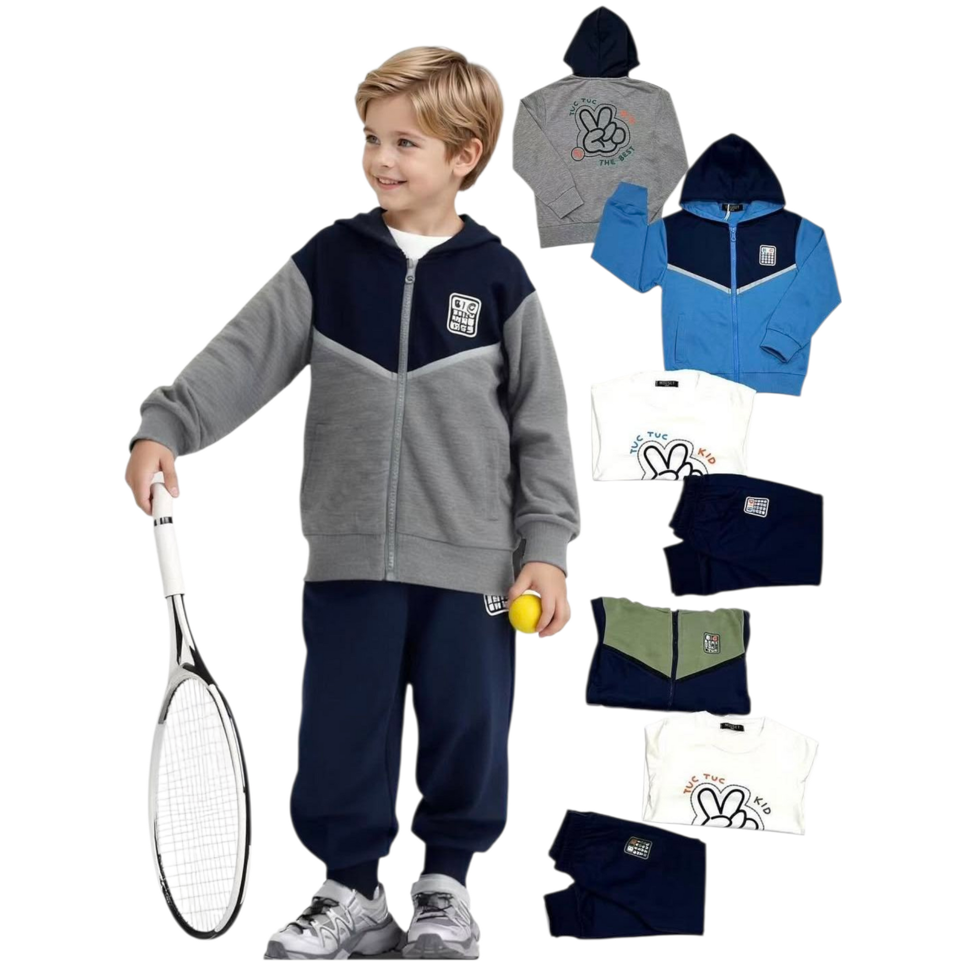 Completo da bambino, in caldo cotone, composto da felpa con cappuccio; t-shirt manica lungo e pantalone abbinato con polsino finale. La felpa presenta un motivo a V sul davanti. Questo completo è perfetto per mantenere al caldo il tuo ragazzo nei mesi autunnali.