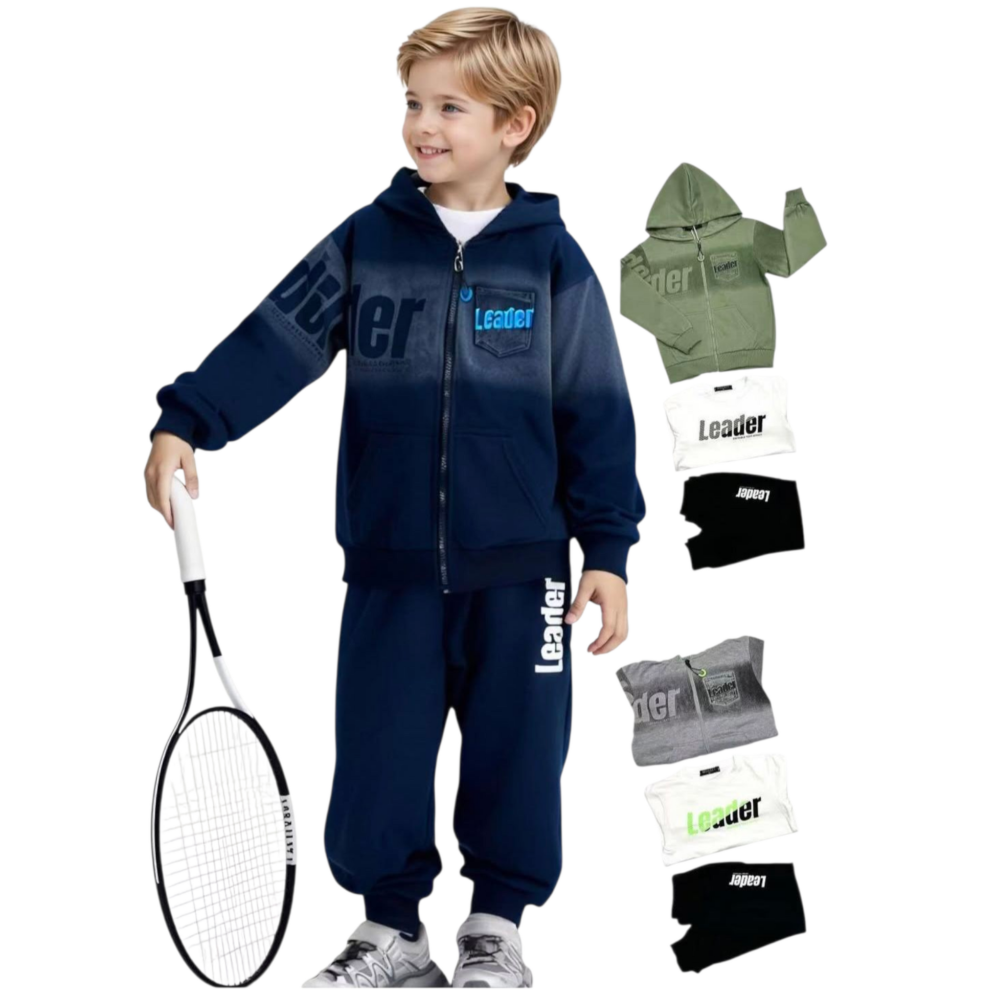 Completo da bambino, in caldo cotone, composto da felpa con cappuccio; t-shirt manica lungo e pantalone abbinato con polsino finale. La felpa presenta una stampa scritta sul davanti. Questo completo è perfetto per mantenere al caldo il tuo ragazzo nei mesi autunnali.