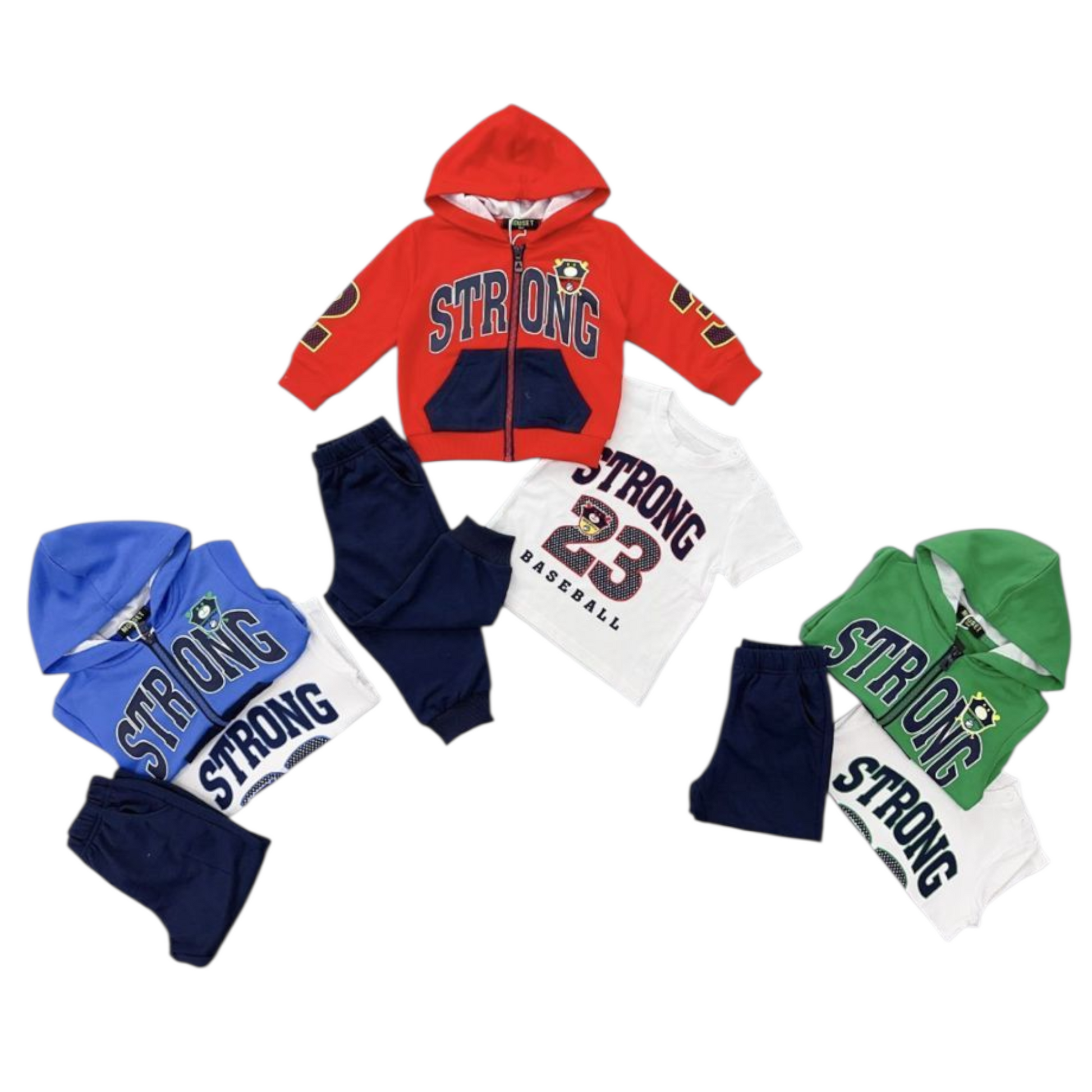 Completo a 3 pezzi da bambino, in cotone, composto da felpa con cappuccio, t-shirt manica corta e comodo pantalone con polsini. Confortevole e alla moda, la maglietta in cotone è perfetta per la scuola. La felpa con cappuccio ti terrà al caldo durante le giornate più fresche, e la stampa "strong" aggiunge un tocco sportivo unico al tuo look. Confortevole e trendy, il pantalone completa il tuo outfit da campione con stile e praticità.