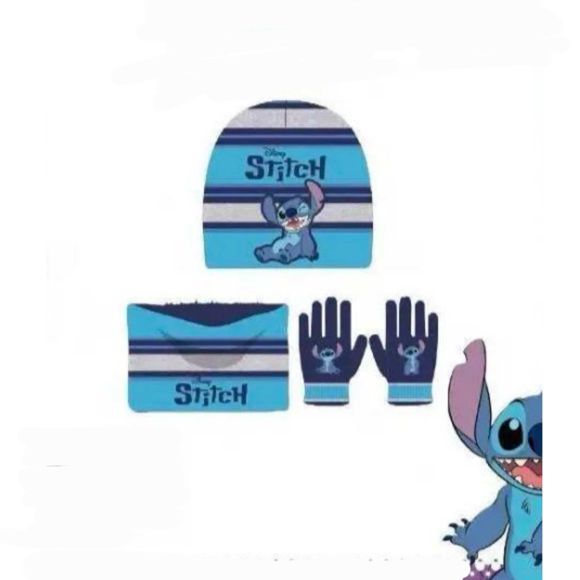 Design unico: Cuffia con risvolto per una maggiore vestibilità, viso di Stitch ricamato al centro.Scaldacollo abbinato. Scaldacollo morbido con patch "Stitch" e scritta, ideale per proteggere gola e collo dal freddo.Guanti con dettaglio di Stitch stampato sul dorso.Tessuto morbidissimo.