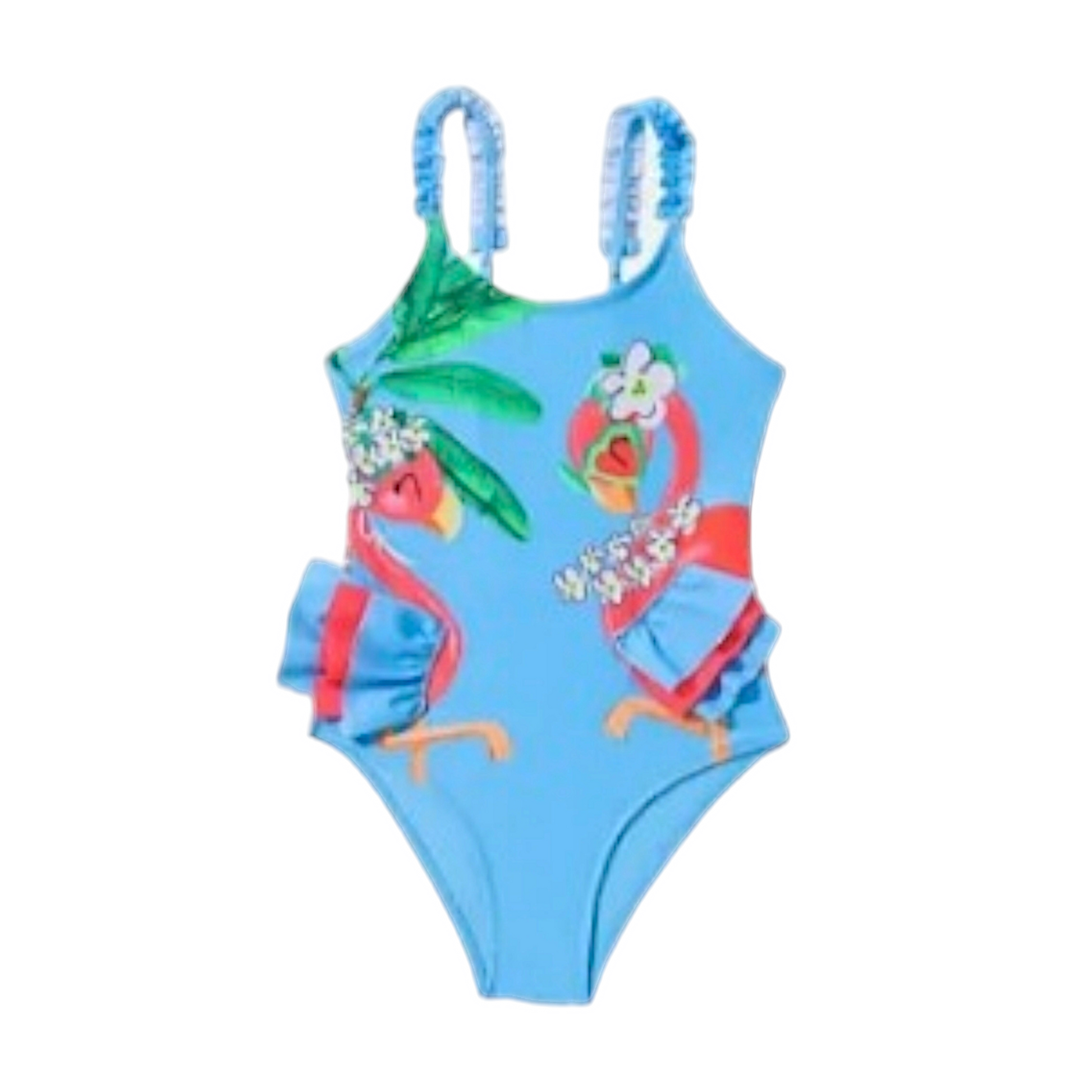Costume intero con delicata stampa fenicottero con graziosi volant a lato, perfetto per splendide giornate al mare. Spalline regolabili per una vestibilità perfetta e comoda. Realizzato in tessuto elasticizzato e confortevole per garantire il massimo comfort durante il gioco in spiaggia.