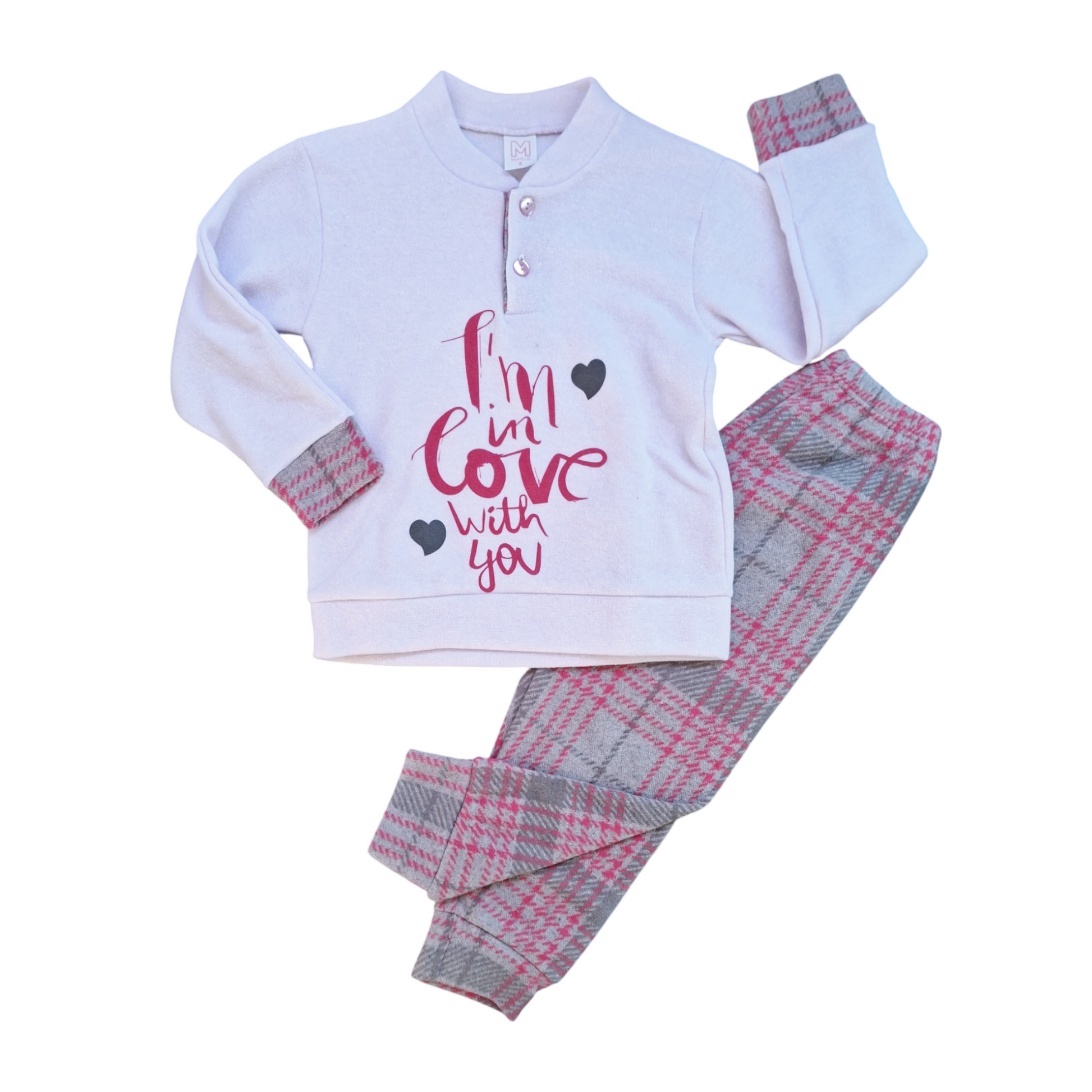 Pigiama da bambina in morbido punto milano, pile cotone, a serafino; con bottoni e stampa sul davanti, fascione in vita. Pantalone con elastico in vita e polsino finale. Prodotto made in Italy.