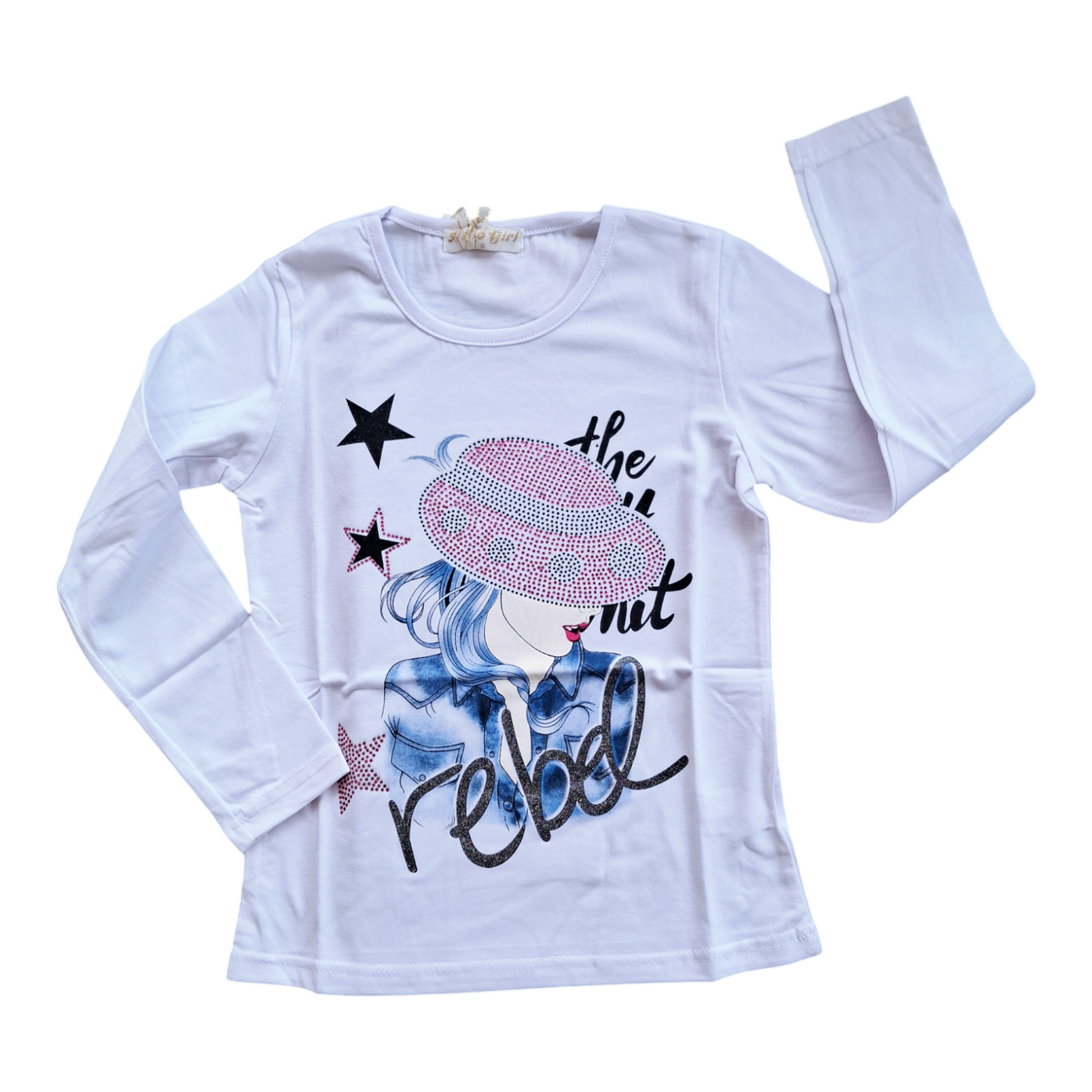 Maglietta da bambina in cotone, perfetta per il guardaroba della tua piccola. Realizzata con materiali di alta qualità, garantisce comfort e stile in ogni occasione. Disponibile in varie taglie per adattarsi perfettamente alla tua bambina, questa maglietta è ideale per le giornate più fresche e per creare look alla moda e confortevoli. In cotone a manica lunga con stampa ragazza con strass sul davanti per un tocco glamour al look della bambina. Ha una vestibilità scarsa, si consiglia l'acquisto di una taglia in più