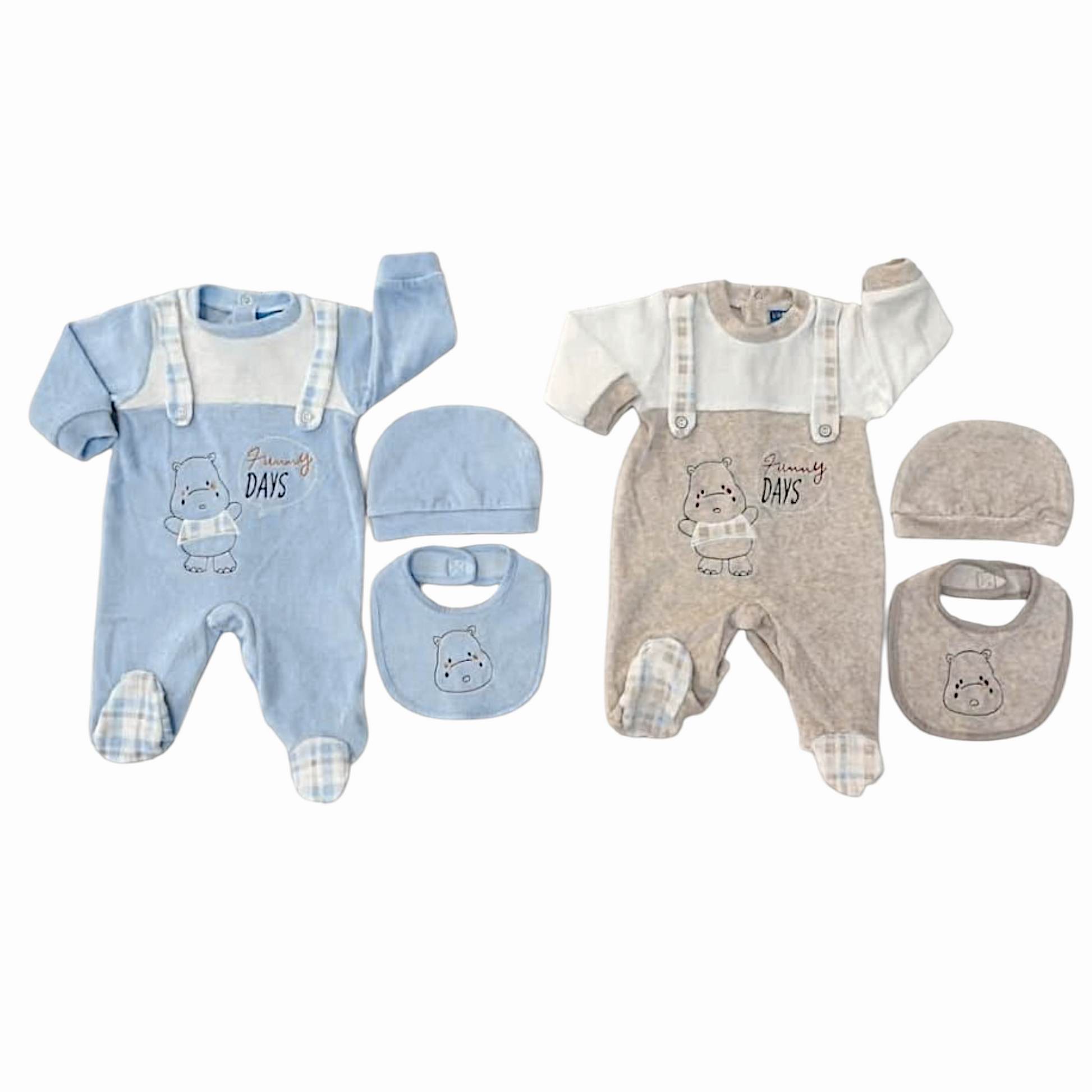 Tutina da neonato con cuffietta e bavaglino abbinati, è l'ideale per il tuo piccolo.